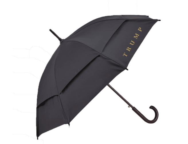 二重パネルの 41 インチの傘ほど「力に道を譲れ」と書かれたものはありません。ゴールドのTRUMPロゴが入ったクラシックなブラックのこの高品質キャノピーは、入場してドライな状態を保ちたい人に最適です。各車、オフィス、家に1つずつ置いてください!